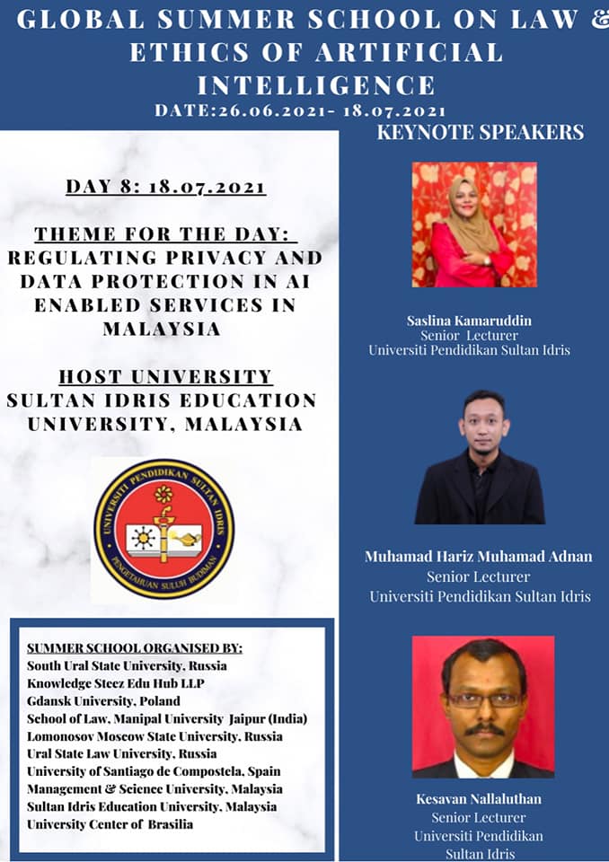 Keynote Speaker – The Online Global Summer School On Law & Ethics Of Artificial Intelligence dari 26.06.2021 hingga 18.07.2021.