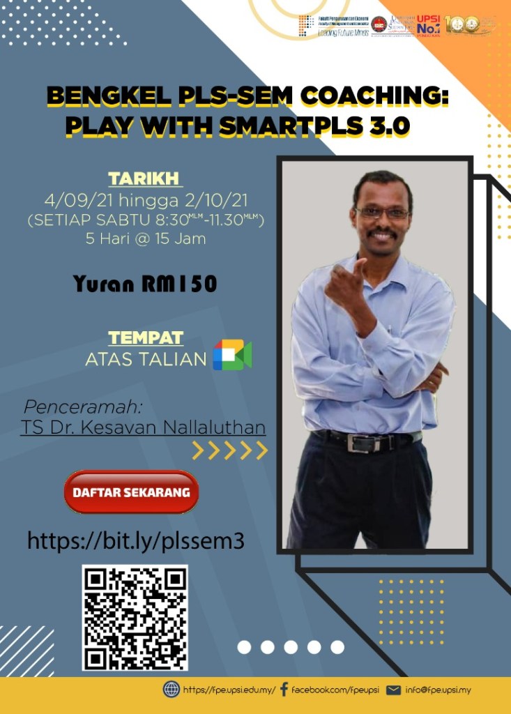 PLS-SEM Coaching: Play with SmartPLS 3.0 (Universiti Pendidikan Sultan Idris) 4 September 2021, 11 September 2021, 18 September 2021, 25 September 2021 & 2 October 2021.
