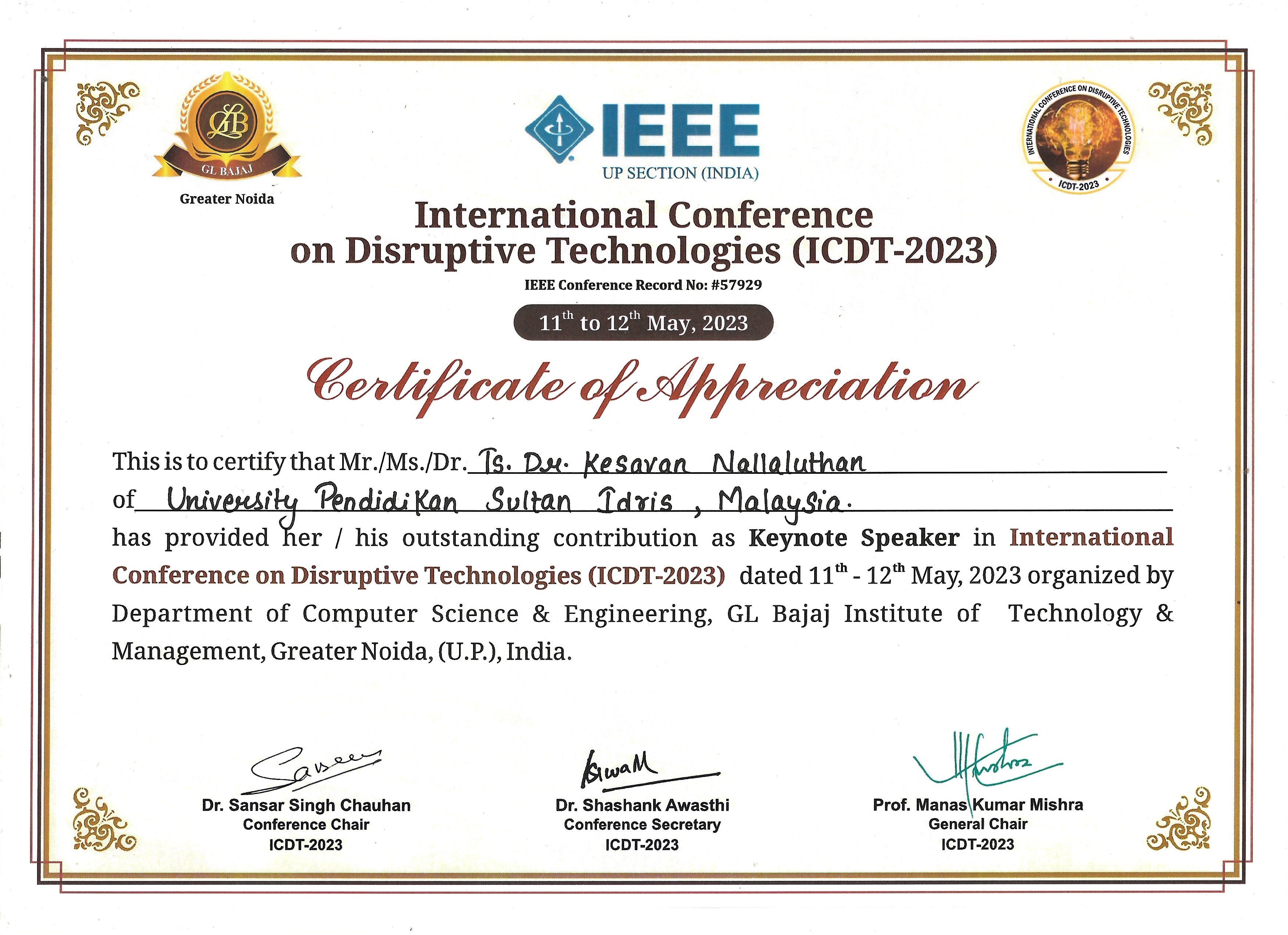 Keynote Speaker – IEEE International Conference on Disruptive Technologies (ICDT-2023) 11 May 2022 – 12 May 2022