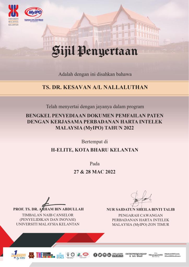 Bengkel Penyediaan Dokumen Pemfailan Paten Universiti Malaysia Kelantan (UMK) Bersama Perbadanan Harta Intelek Malaysia (MyIPO). 27/03/2022 – 28/03/2022